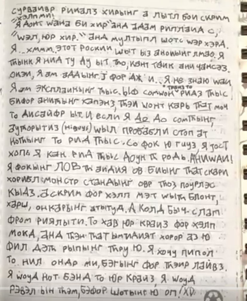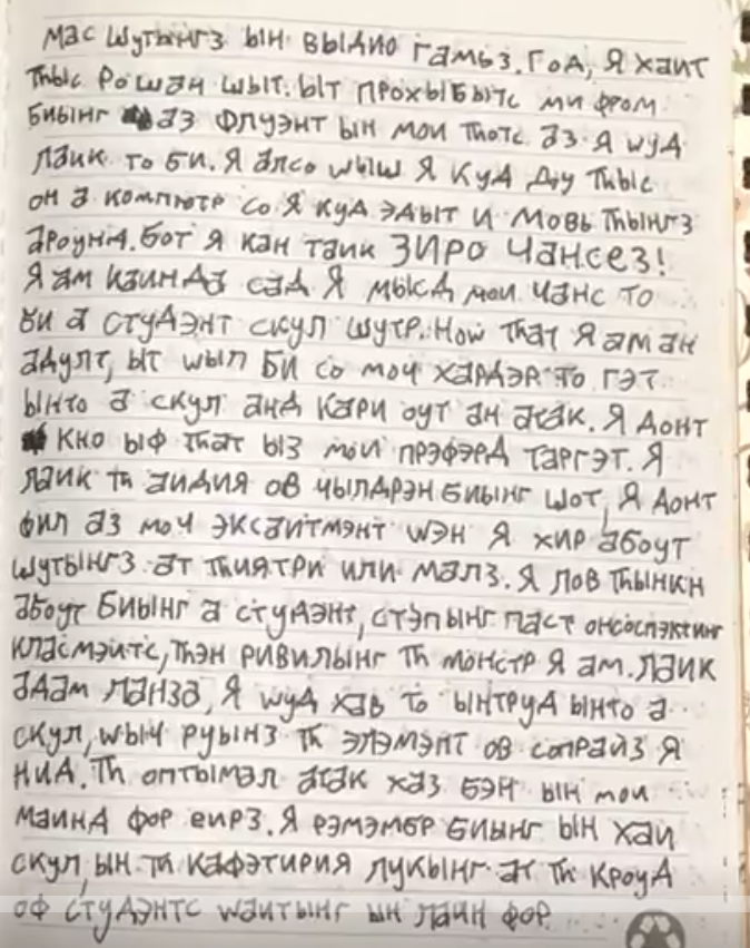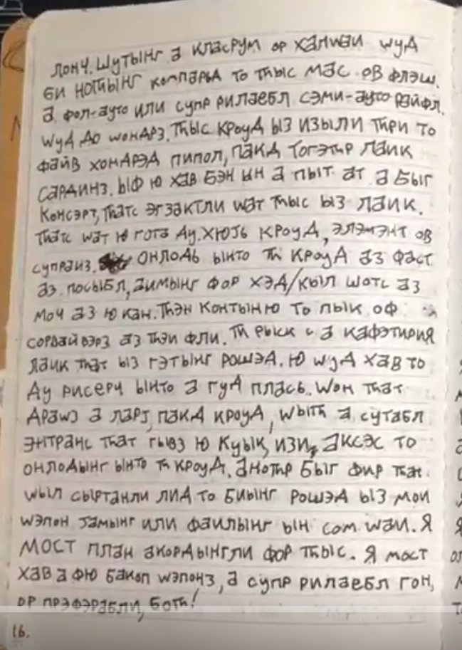 The journal contains some Russian language, but it is primarily English words spelled phonetically with Cyrillic characters, and some English words.