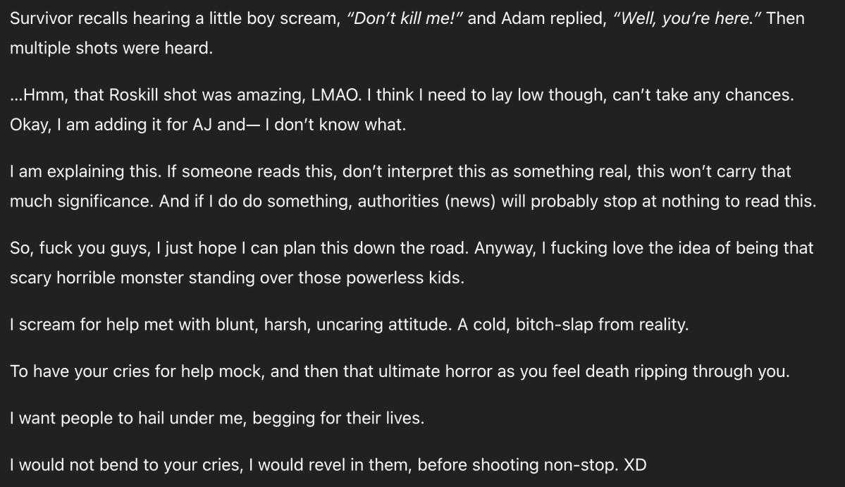 This entry shows the shooterβs violent ideation has intensified to sadistic fantasies. https://t.co/aLeAEl4I6k