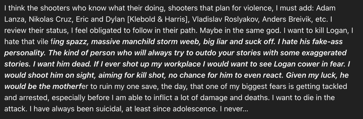 This note is a manifesto-style threat with explicit intent, named individual targets, workplace context, and references to previous mass shootings. It demonstrates premeditation, fixation on past attackers, and suicidal motivation. https://t.co/p8YXtwFVRB