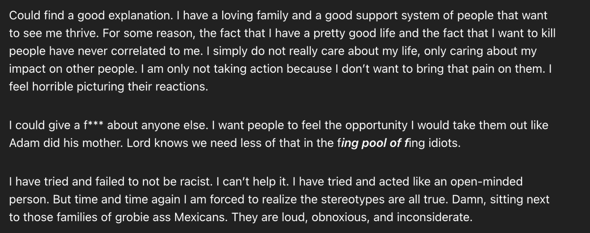 This page establishes a psychological profile of grievance, dehumanization, and fixation. It suggests target identification, ideological justification and planning awareness. https://t.co/LzoNIn1NhN
