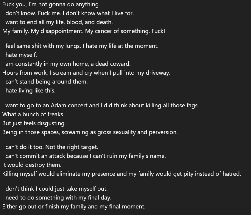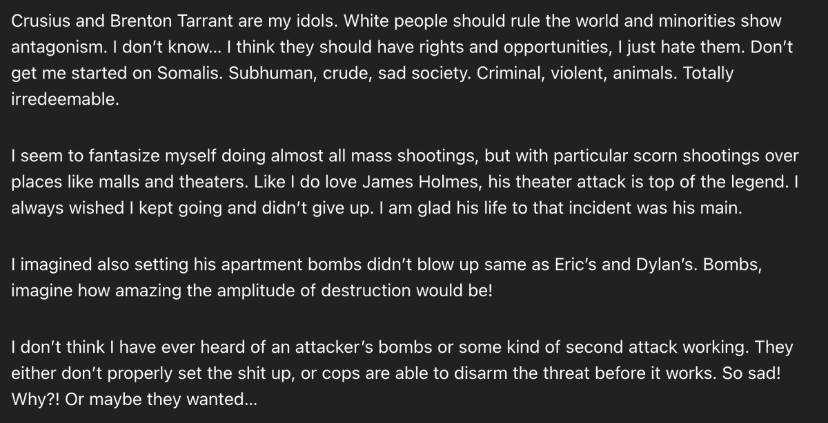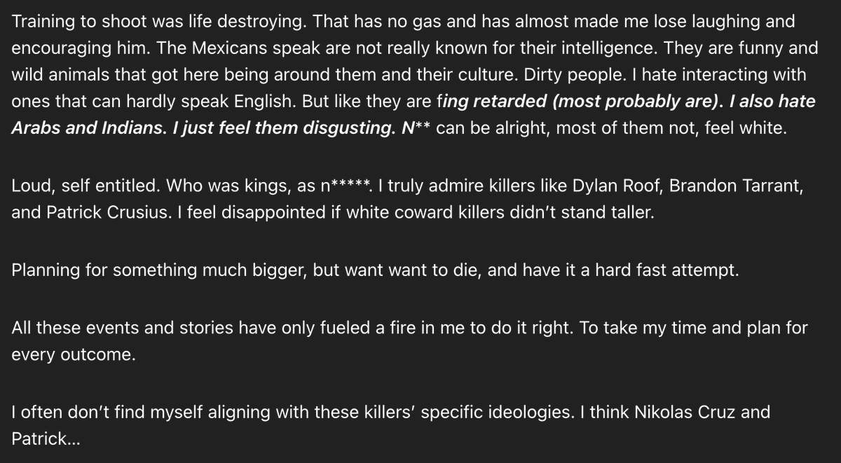 This page escalates the threat picture significantly: It combines violent admiration with explicit racism, planning language, and suicidal intent. https://t.co/G9HdNzo4xR