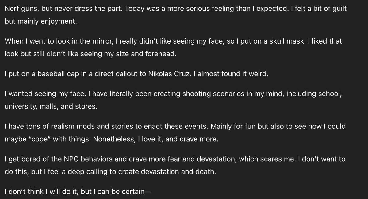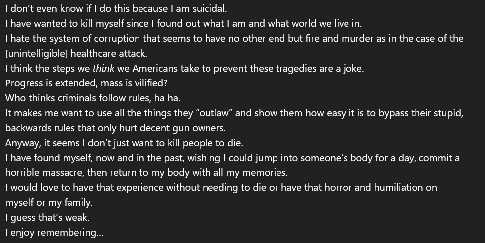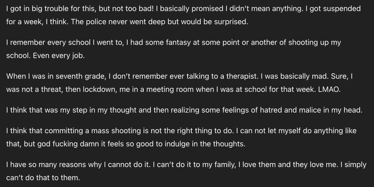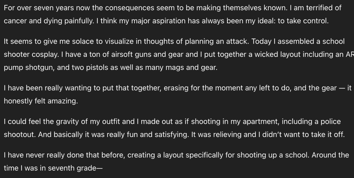 @elonmusk The shooter continues describing his suicidal ideation, and extreme mental illness. https://t.co/3M64ghdDV9