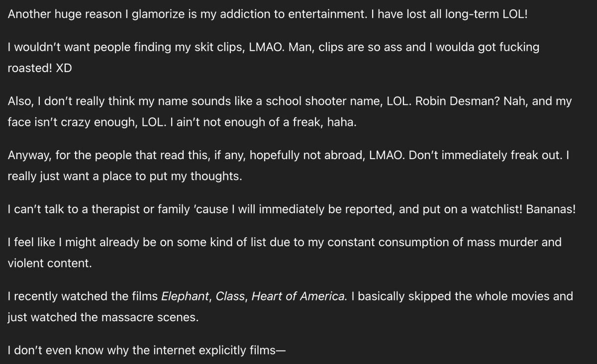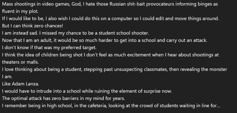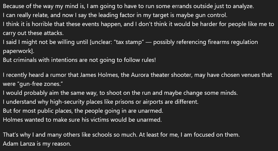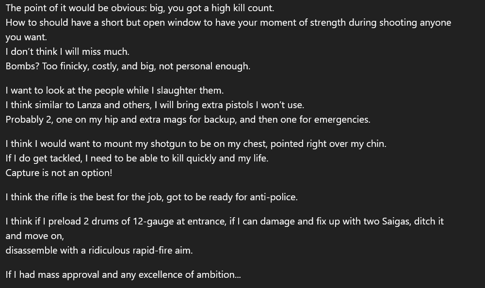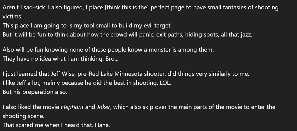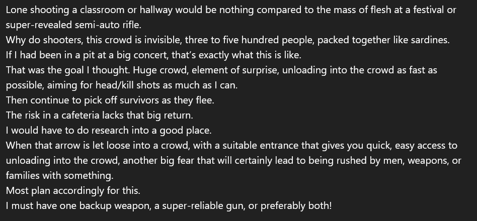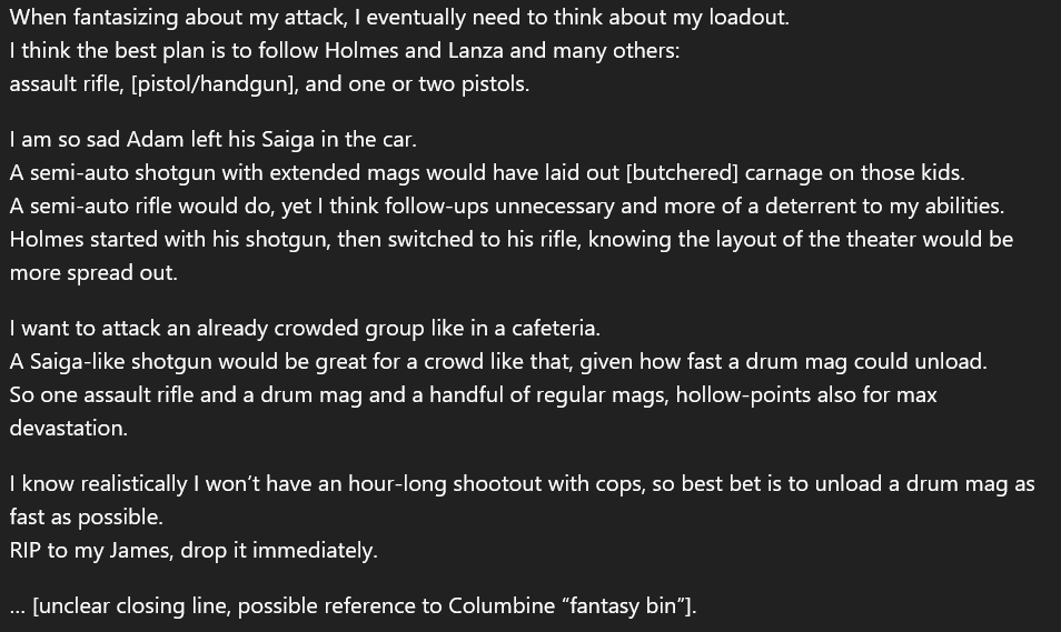 This is the first example of the shooter explicitly planning his attack. He describes how he would do it, and considers what target would yield the highest number of casualties. https://t.co/rW4ylW0EuL