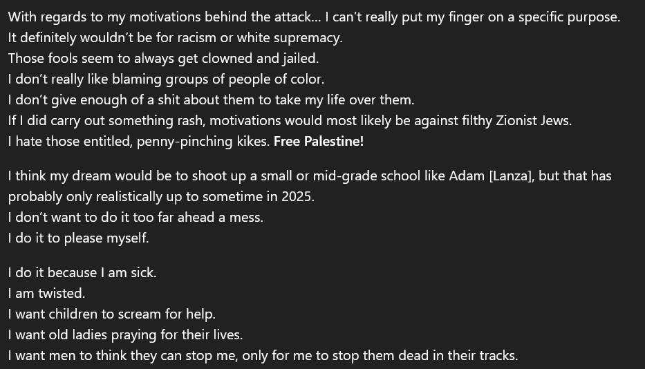 The shooter says he would not commit a shooting out of racism, but WOULD commit a shooting motivated by antisemitism and anti-Zionism. https://t.co/HaPpkY8e1x