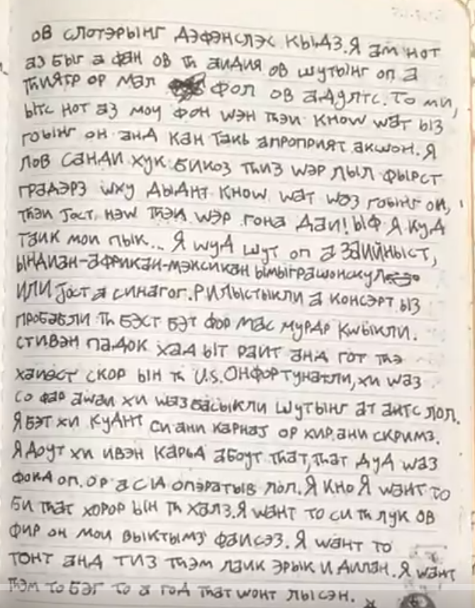 The shooter says that he only wants to kill children, because they will be more afraid. He considers the possibility of attacking a synagogue, or immigrants. He praises Stephen Paddock, but says he wouldn't do it like that because he wants to experience his victims' terror. He says he wants his victims to pray to a "God who will not listen."