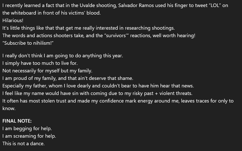 May 28th: The shooter says he will probably not ever do a shooting, because he has "too much to live for." He writes that he is begging for help, probably referencing Rick and Morty. https://t.co/NwO1zI5vAh
