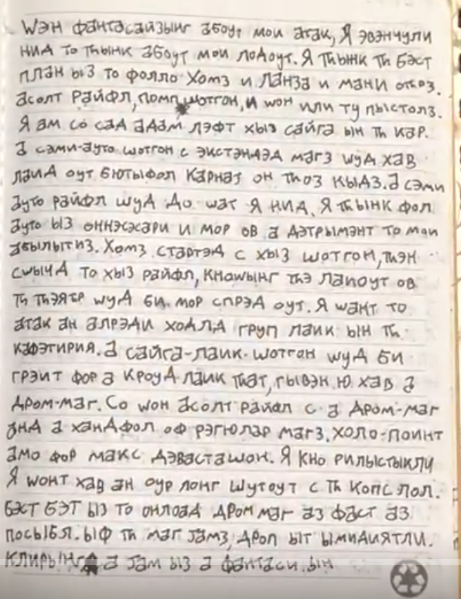 This page solidifies the attack plan framework: target type (crowded), weapons (rifle + shotgun + pistols), contingencies (anti-capture, anti-police). The shooter says he wants to "look at" his victims as he "slaughters" them. https://t.co/MvWM2n1scu