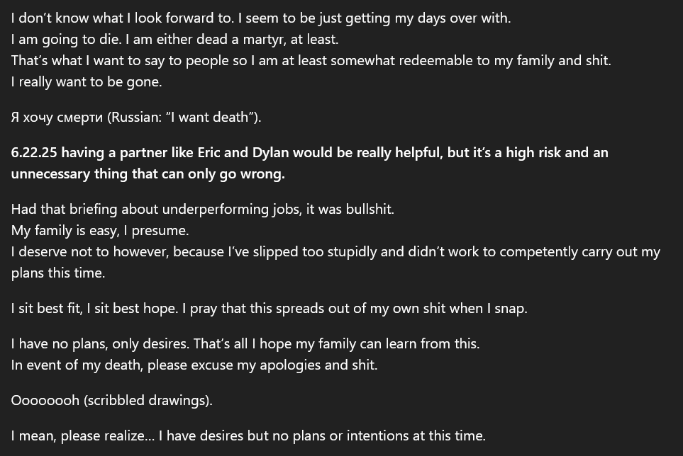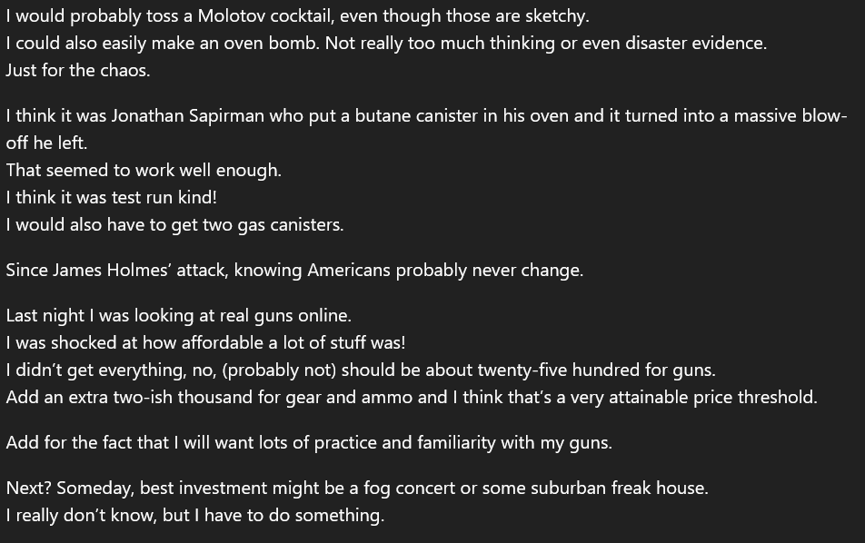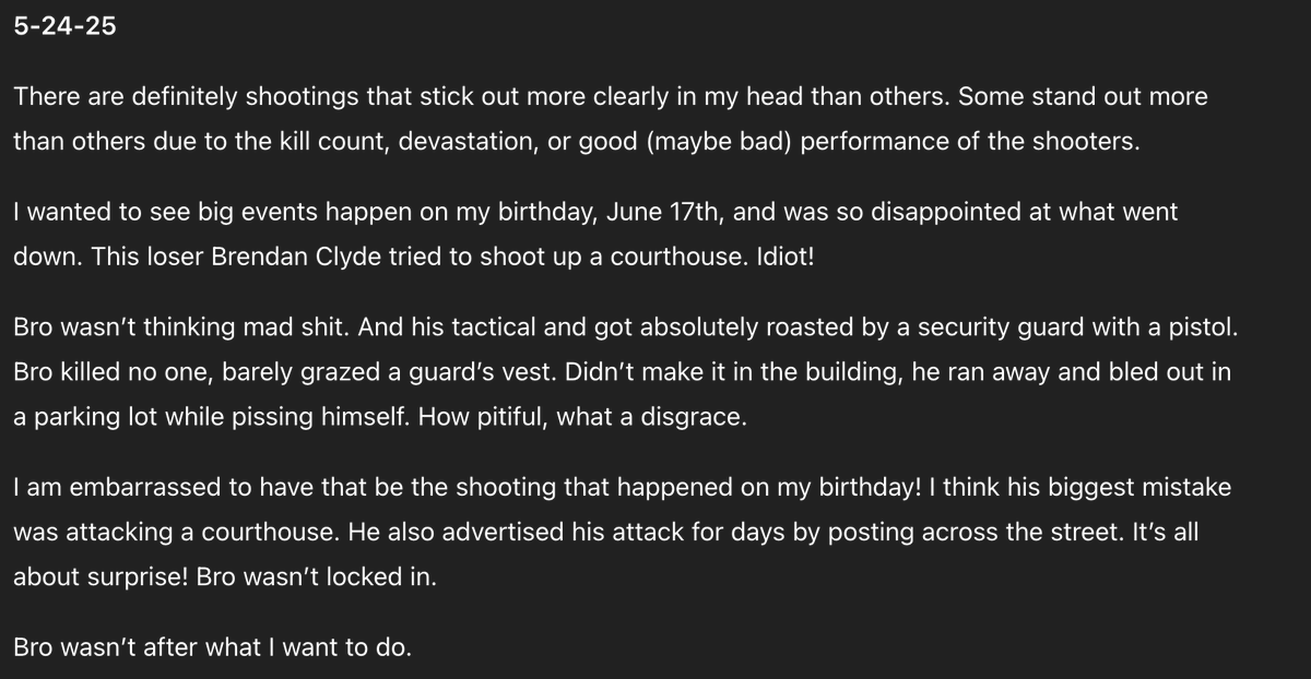 May 24th, 2025: The shooter begins critiquing other mass shooters for what he believes were mistakes they made. https://t.co/YQfmuYFuxl